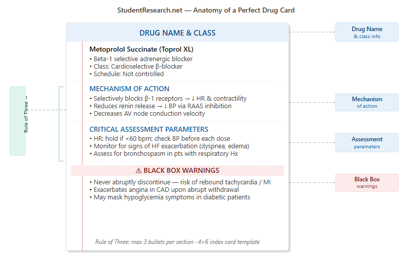 Every high-quality card must be standardized to ensure you are capturing the data that matters most for exams and clinical practice. Focus on the core pillars of pharmacology—the “why” and “how” behind every medication—to maximize your study efficiency. A well-constructed card serves as a quick-reference guide that bridges the gap between the textbook and the bedside.