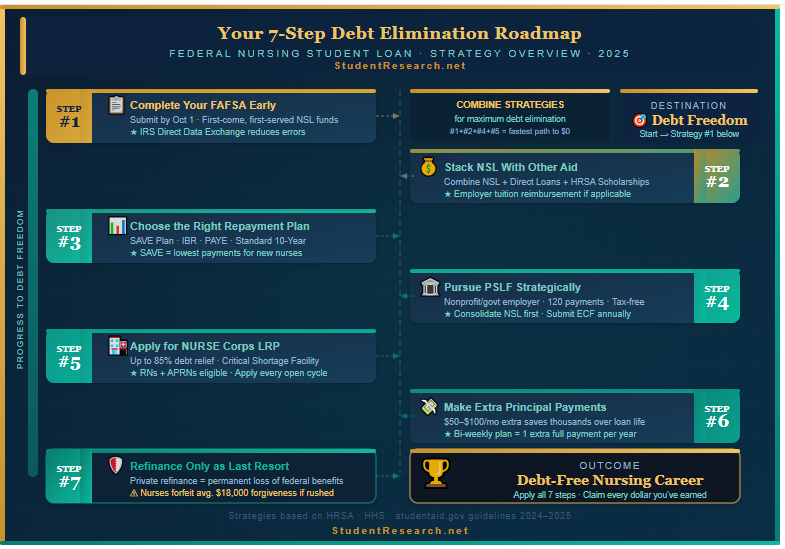 Now that you understand the federal nursing student loan landscape clearly, it is time to take decisive action with the 7 most effective debt management strategies available to nurses in 2025. Each strategy builds on the next, creating a comprehensive roadmap that works whether you owe $10,000 or $100,000 in nursing education debt. The nurses who successfully eliminate their debt fastest are consistently those who combine multiple strategies simultaneously rather than relying on a single approach.